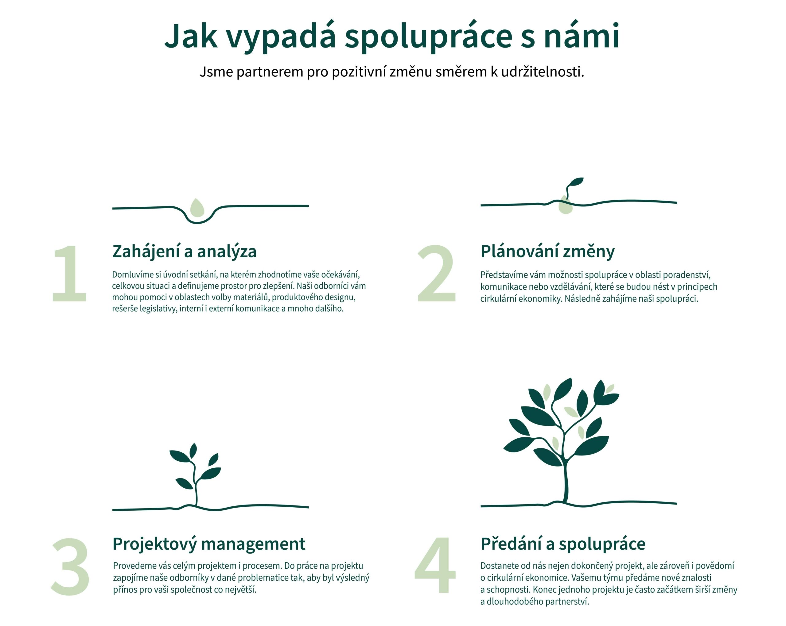 - Konkrétní návrhy a řešení, hledání úspor. Navrhneme vám kroky, které povedou k úsporám v oblasti energetiky, odpadového hospodářství, logistiky, využití materiálů, nebo vám na základě analýzy vašeho podniku navrhneme možnosti pro tvorbu zcela nových byznys modelů.